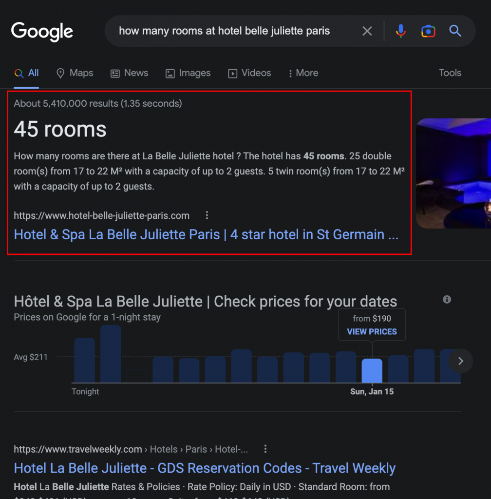– chegar ao snippet em destaque, que classifica o seu hotel no topo dos resultados da pesquisa para consultas específicas (ver captura de ecrã abaixo).