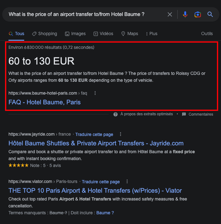 Passo 3: Estas FAQs são integradas no sítio web do hotel de uma forma optimizada para o Google. Estes dados estruturados permitem aos motores de busca compreender melhor o conteúdo da página e exibi-lo mais eficazmente nos resultados de pesquisa (SERP). No nosso caso, as FAQs poderiam ser exibidas nos resultados de pesquisa como fragmentos de dados (ver imagem do ecrã).